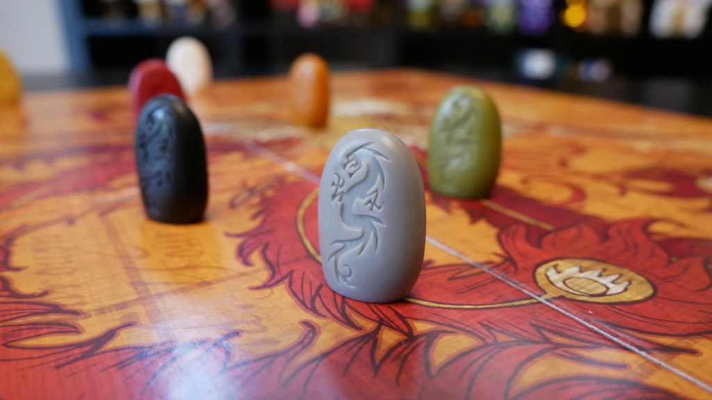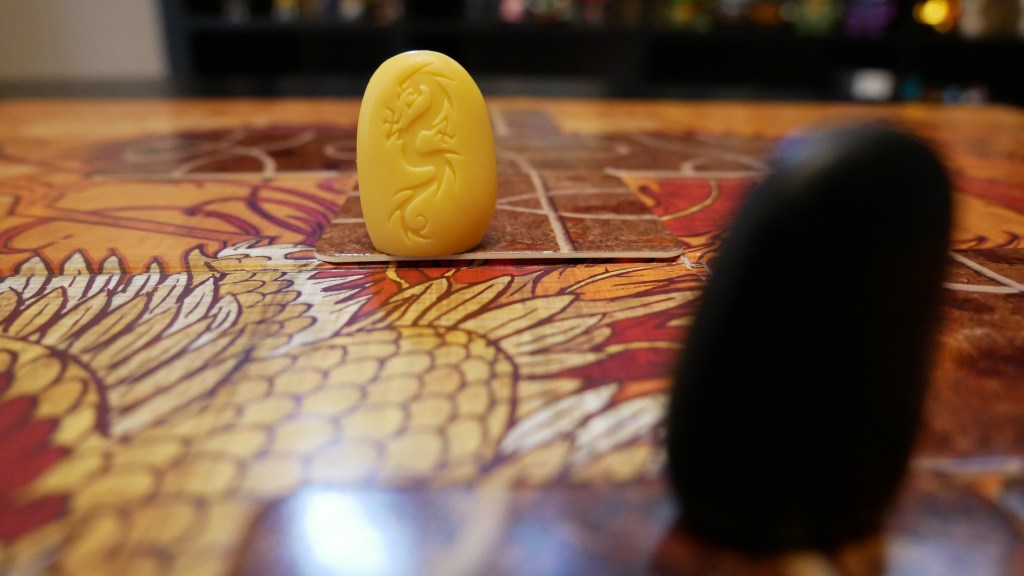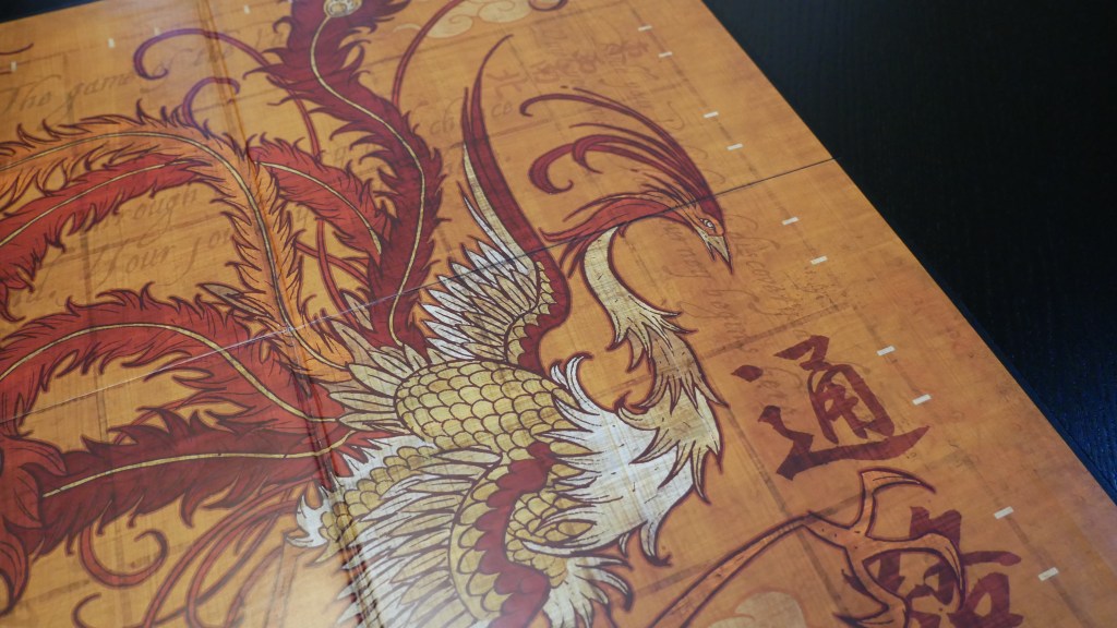 Let’s first look at the art which includes a depiction of a dragon and a phoenix, starting with the dragon. The Asian dragon is on the box, wonderfully presented in a sea of red with yellow and white highlights. Each player pawn is also etched with a minimalist version of the same style of dragon. My first thought was where did this dragon originate from. Based on the Japanese name of the game, I assumed it was Japanese. I also thought the phoenix was the rise from the fire and ashes type, but I’ll get to that shortly. I started my research looking up mythologies surrounding the Japanese dragon and there’s quite a bit.