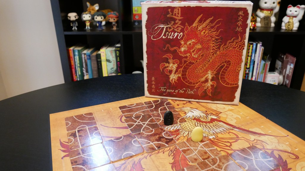 Tsuro is an abstract tabletop board game for 2 to 8 players where players move their dragon pawn within a 6 by 6 grid on top of a beautifully drawn phoenix, with the hope of being the last one standing. Each player holds three tiles which they normally keep hidden from other players. Upon their turn, the player will place her tile down in front of her pawn and then move the pawn or pawns along the path on that card. After each pawn has been moved, if the player is still on the board, she would draw a new card from the draw deck. Play shifts clockwise to the next player. Play continues until there’s one player left or there are no tiles left to place. And sometimes, this leads to more than one winner which is a perfectly sound ending.
